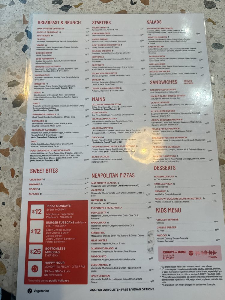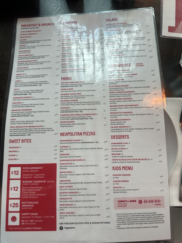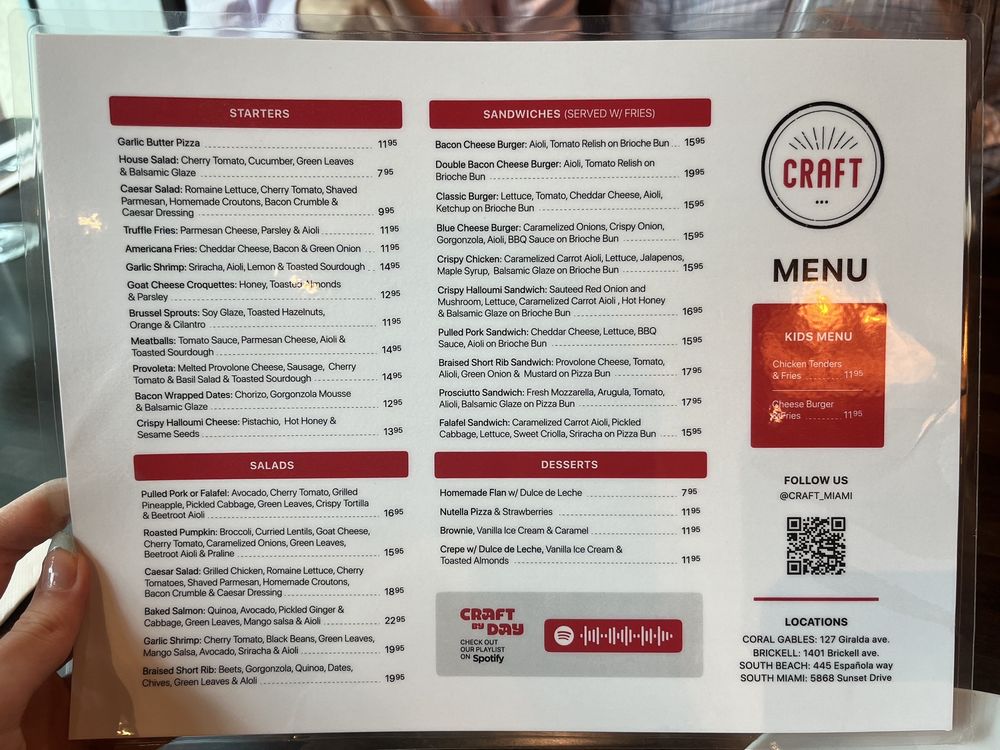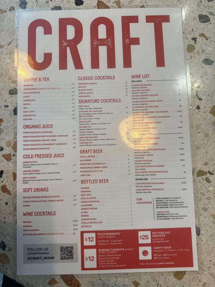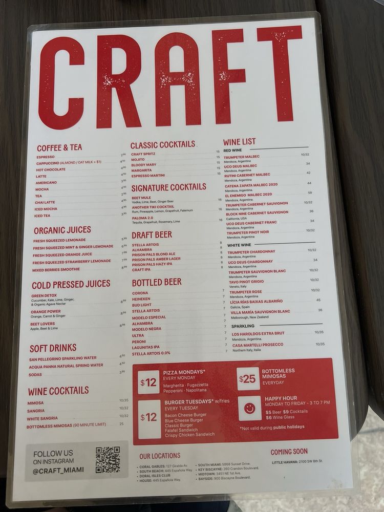 Introducing the menu at CRAFT Bayside, where culinary creativity meets a vibrant atmosphere in Miami. This charming eatery specializes in New American fare, featuring mouthwatering pizzas alongside a delightful brunch selection. Whether you crave a classic margherita with fresh basil or a savory prosciutto pizza, each dish celebrates quality ingredients and bold flavors.